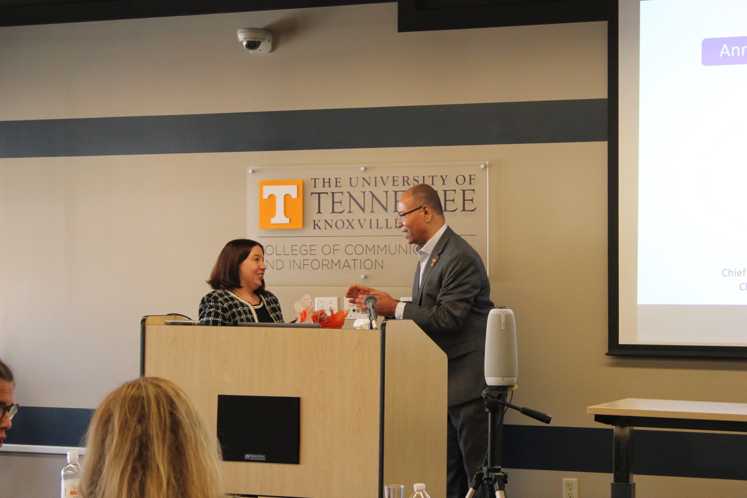 - Dr. Abebe Rorissa, SIS Director, awards Amy Dye-Reeves the Marcellus Turner Alumni Award.